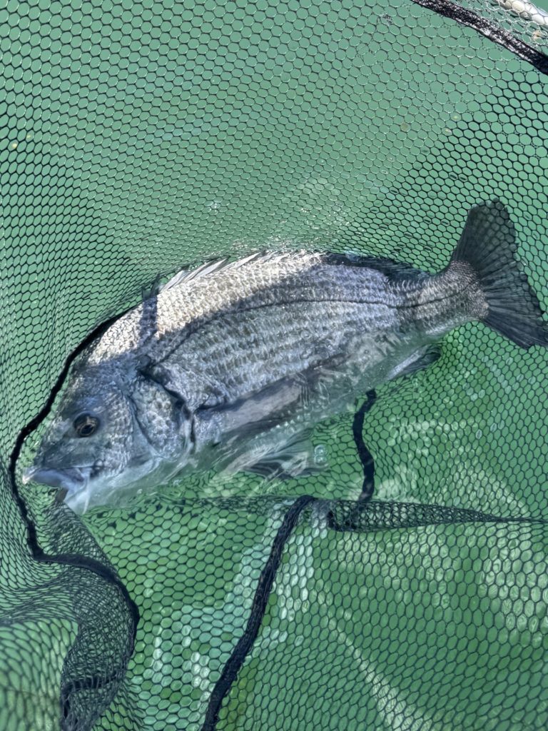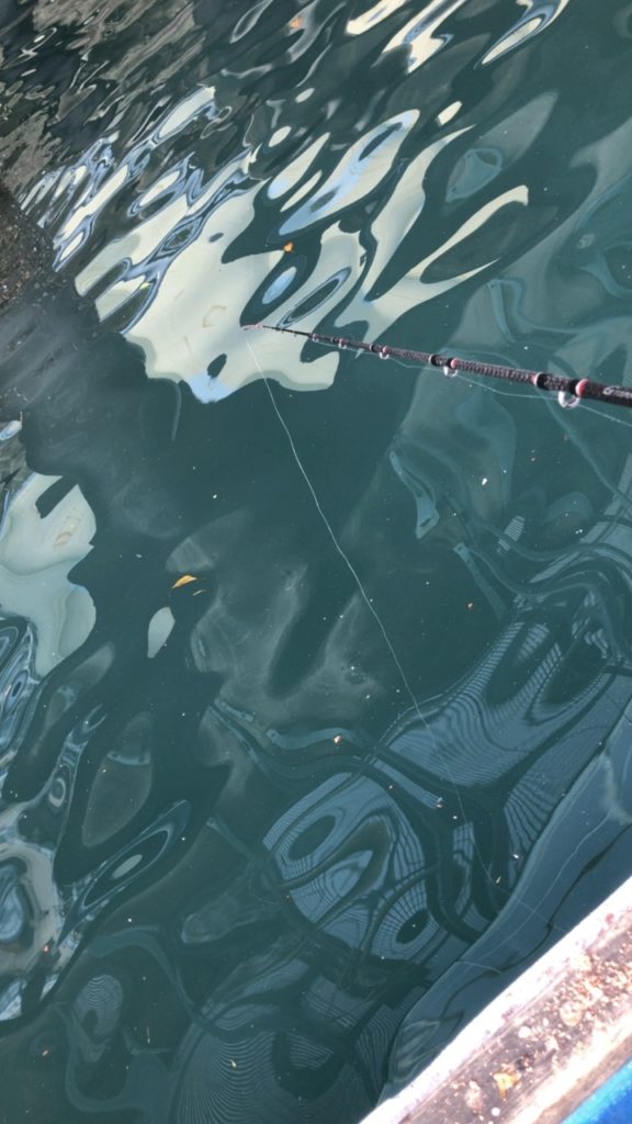 開始直後から私の足元には濁りに誘われた小魚が集まり始め、「これは今日は早いかも?」と思っていたら、案の定開始から30分もしないうちに私竿の穂先が海面に突き刺さり、大きな沈み込みのアタリ!合わせるとズシッと重く、上がってきたのは黒光りする年無しクラス(50cm級)の大チヌでした。隣の知人はまだアタリもない状況で、明らかにこちらの方が早く魚を寄せて食わせることができたのです。